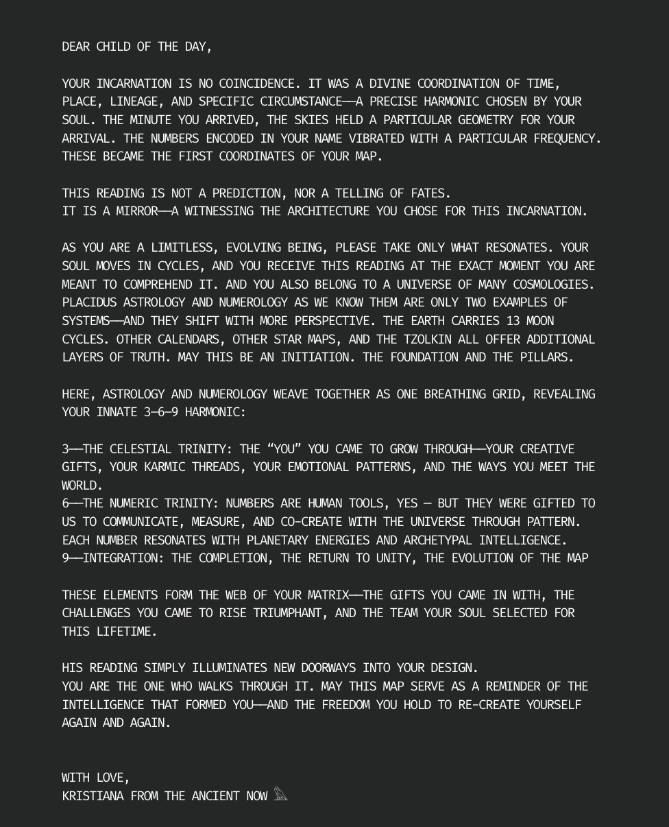 A personalised synergy of astrology + numerology anchored into a reading exploring your incarnation as coordinates; where stars act as portals, patterns evolve, and gifts and challenges are consciously integrated through lived experience.